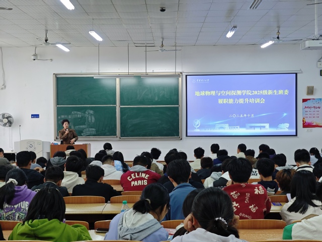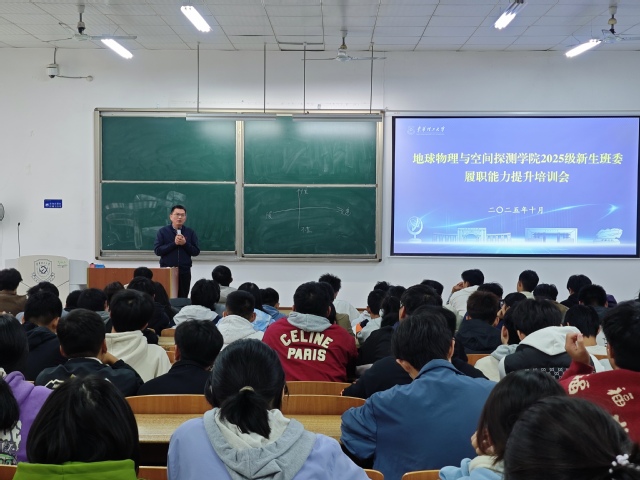为加强班级学生干部队伍建设,提升班委履职能力与服务意识,2025年10月21日,地球物理与空间探测学院组织召开新生班委履职能力提升培训会。学院党委书记黄合湘、党委副书记颜丽娟出席,2025级新生辅导员李爱、全体新生班委和部分老生班委代表共140余人参加。
