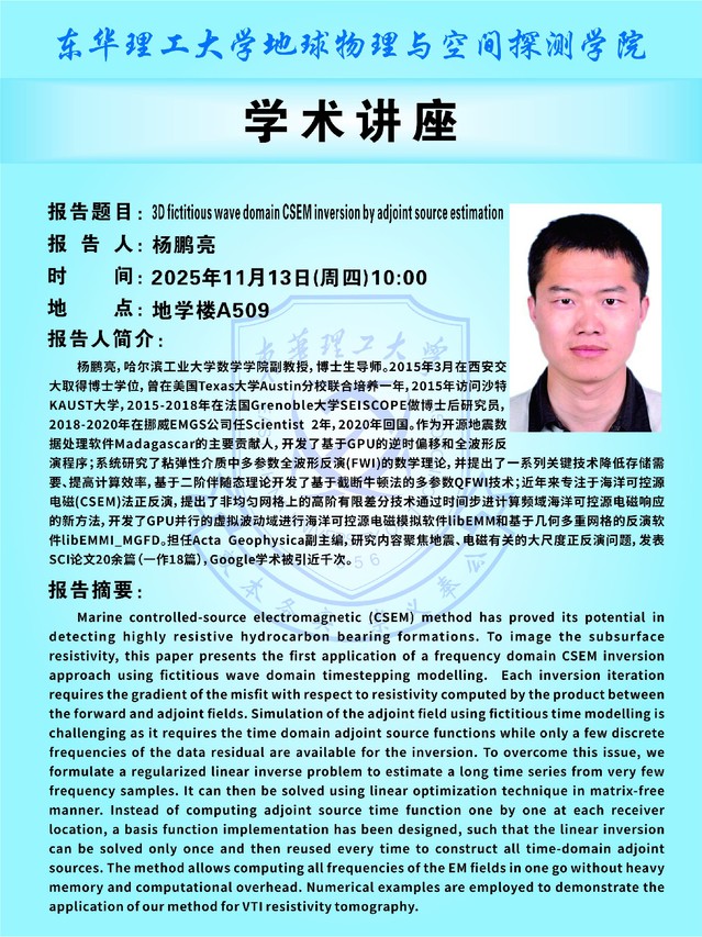 【地空学术讲座】3D fictitious wave domain CSEM inversion by adjoint source estimation